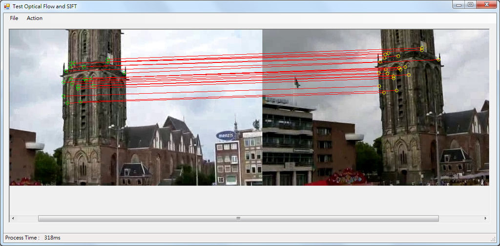 struct feature* feat1, * feat2, * feat; struct feature** nbrs; struct kd_node* kd_root; //--------------------------------------------------------- CvPoint pt1, pt2; double d0, d1; int n1, n2, k, i, m = 0; //--------------------------------------------------------- iplRst = stack_imgs( iplSrc1 , iplSrc2 ); //--------------------------------------------------------- n1 = sift_features( iplSrc1 , & feat1 ); n2 = sift_features( iplSrc2 , & feat2 ); kd_root = kdtree_build( feat2 , n2 ); //--------------------------------------------------------- for(i=0;i<n1;i++) { feat = feat1 + i; k = kdtree_bbf_knn( kd_root , feat , 2 , & nbrs , KDTREE_BBF_MAX_NN_CHKS ); if( k==2 ) { d0 = descr_dist_sq( feat , nbrs[0] ); d1 = descr_dist_sq( feat , nbrs[1] ); if( d0 < d1 * NN_SQ_DIST_RATIO_THR ) { pt1 = cvPoint( cvRound( feat->x ), cvRound( feat->y ) ); pt2 = cvPoint( cvRound( nbrs[0]->x ), cvRound( nbrs[0]->y ) ); pt2.x += iplSrc1->width; cvLine( iplRst, pt1, pt2, CV_RGB(255,0,0), 1, 8, 0 ); cvCircle( iplRst, pt1, 4, CV_RGB(0,255,0), 1, 8, 0 ); cvCircle( iplRst, pt2, 4, CV_RGB(255,255,0), 1, 8, 0 ); m++; feat1[i].fwd_match = nbrs[0]; } } free( nbrs ); } //--------------------------------------------------------- kdtree_release( kd_root ); free( feat1 ); free( feat2 );