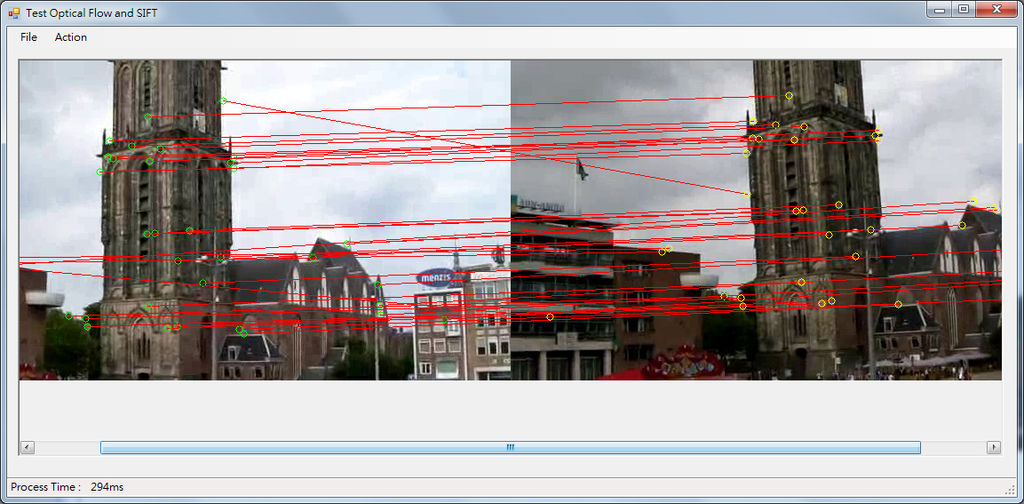 CvMemStorage* storage = cvCreateMemStorage(0); //--------------------------------------------------------- IplImage* image = cvCreateImage( cvGetSize( iplSrc1 ) , IPL_DEPTH_8U , 1 ); IplImage* object = cvCreateImage( cvGetSize( iplSrc2 ) , IPL_DEPTH_8U , 1 ); //--------------------------------------------------------- cvCvtColor( iplSrc1 , image , CV_BGR2GRAY ); cvCvtColor( iplSrc2 , object , CV_BGR2GRAY ); IplImage* object_color = cvCreateImage(cvGetSize(object), 8, 3); cvCvtColor( object, object_color, CV_GRAY2BGR ); CvSeq *objectKeypoints = 0, *objectDescriptors = 0; CvSeq *imageKeypoints = 0, *imageDescriptors = 0; int i; CvSURFParams params = cvSURFParams(500, 1); double tt = (double)cvGetTickCount(); cvExtractSURF( object, 0, &objectKeypoints, &objectDescriptors, storage, params ); cvExtractSURF( image, 0, &imageKeypoints, &imageDescriptors, storage, params ); tt = (double)cvGetTickCount() - tt; CvPoint src_corners[4] = {{0,0}, {object->width,0}, {object->width, object->height}, {0, object->height}}; CvPoint dst_corners[4]; IplImage* correspond = cvCreateImage( cvSize(image->width+object->width, Math::Max( object->height , image->height )), 8, 3 ); cvSetImageROI( correspond, cvRect( 0, 0, object->width, object->height ) ); cvCopy( myCV::iplSrc, correspond ); cvSetImageROI( correspond, cvRect( object->width, 0, correspond->width, correspond->height ) ); cvCopy( myCV::iplObj, correspond ); cvResetImageROI( correspond ); vector<int> ptpairs; #ifdef USE_FLANN flannFindPairs( objectKeypoints, objectDescriptors, imageKeypoints, imageDescriptors, ptpairs ); #else findPairs( objectKeypoints, objectDescriptors, imageKeypoints, imageDescriptors, ptpairs ); #endif for( i = 0; i < (int)ptpairs.size(); i += 2 ) { CvSURFPoint* r1 = (CvSURFPoint*)cvGetSeqElem( imageKeypoints, ptpairs[i+1] ); CvSURFPoint* r2 = (CvSURFPoint*)cvGetSeqElem( objectKeypoints, ptpairs[i] ); cvLine( correspond, cvPointFrom32f(r1->pt), cvPoint(cvRound(r2->pt.x+object->width), cvRound(r2->pt.y)), CV_RGB(255,0,0) ); cvCircle( correspond, cvPointFrom32f(r1->pt), 4, CV_RGB(0,255,0), 1, 8, 0 ); cvCircle( correspond, cvPoint(cvRound(r2->pt.x+object->width), cvRound(r2->pt.y)), 4, CV_RGB(255,255,0), 1, 8, 0 ); }